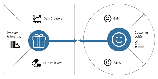 A useful tool for conceptualising the value proposition for your company is something called the “Value Proposition Canvas” (see image below). On the right hand side is a chosen market segment, with the typical customer needs (jobs) in that segment along with gains they are seeking and pains they wish to void. On the left hand side are the company’s product and services, interpreted in the form of the gain creators and pain relievers which they can bring to that specific segment. The tool can be used to evaluate multiple market segments to understand how the company’s solutions might be most effective as Gain Creators or Pain Relievers for each particular niche.
